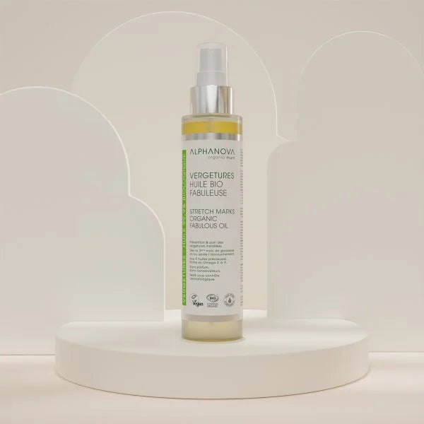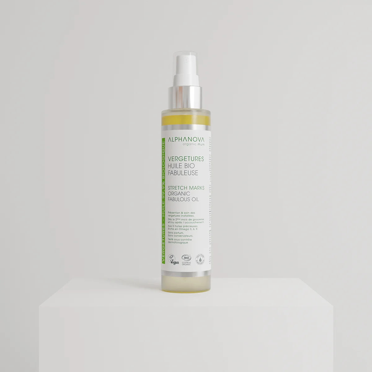 The fabulous stretch mark oil organic ALPHANOVA organic mum is formulated with five precious oils, known to improve skin elasticity and for their repairing virtues: Sweet almond, baobab, apricot, musk rose. This combination of oils rich in omega 3, 6 and 9 has resulted in a very effective, non-sticky formula that leaves the skin soft and supple upon application. Its fast absorption allows to get dressed immediately after application. This 99.6% organic treatment can be used for prevention and on existing stretch marks. Without conservative, without coloring agent, without perfume and without essential oils, it is ideal: