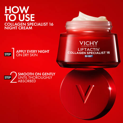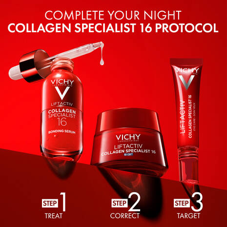 Discover the Liftactiv Collagen Specialist 16 Night Cream powered with CO-BOND TECHNOLOGY to boost and bond all collagen types and correct 16 ageing signs. Improving: wrinkles, fine lines, firmness, plumpness, contour definition, smoothness, skin texture, tonicity, density, skin strength, skin repair, radiance, softness, suppleness, hydration, evenness. Product of 32 years of research, 1000+ molecules tested and 42 publications.