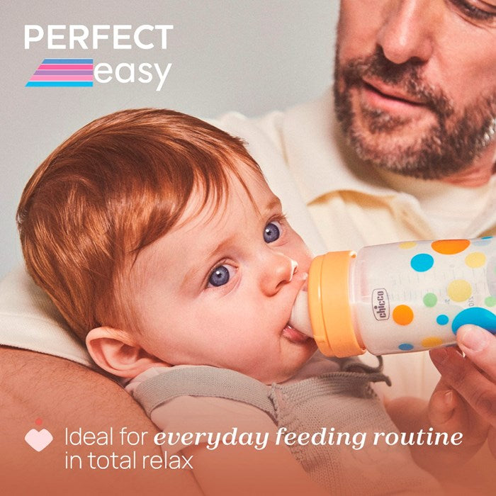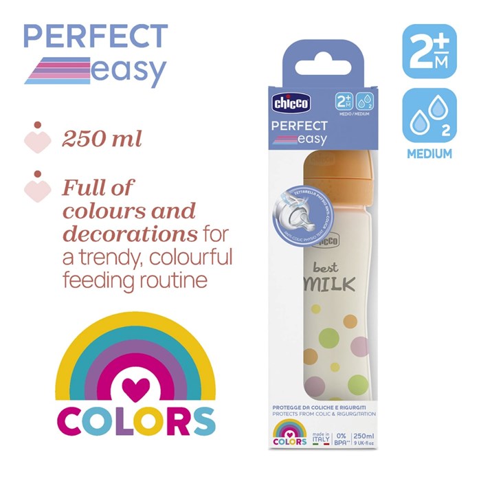 The Chicco Perfect Easy Colors Baby Bottle is designed to make feeding a trendy and colorful routine while prioritizing your baby's comfort. This bottle is specifically engineered with an advanced anti-colic system to help protect against colic and regurgitation.
