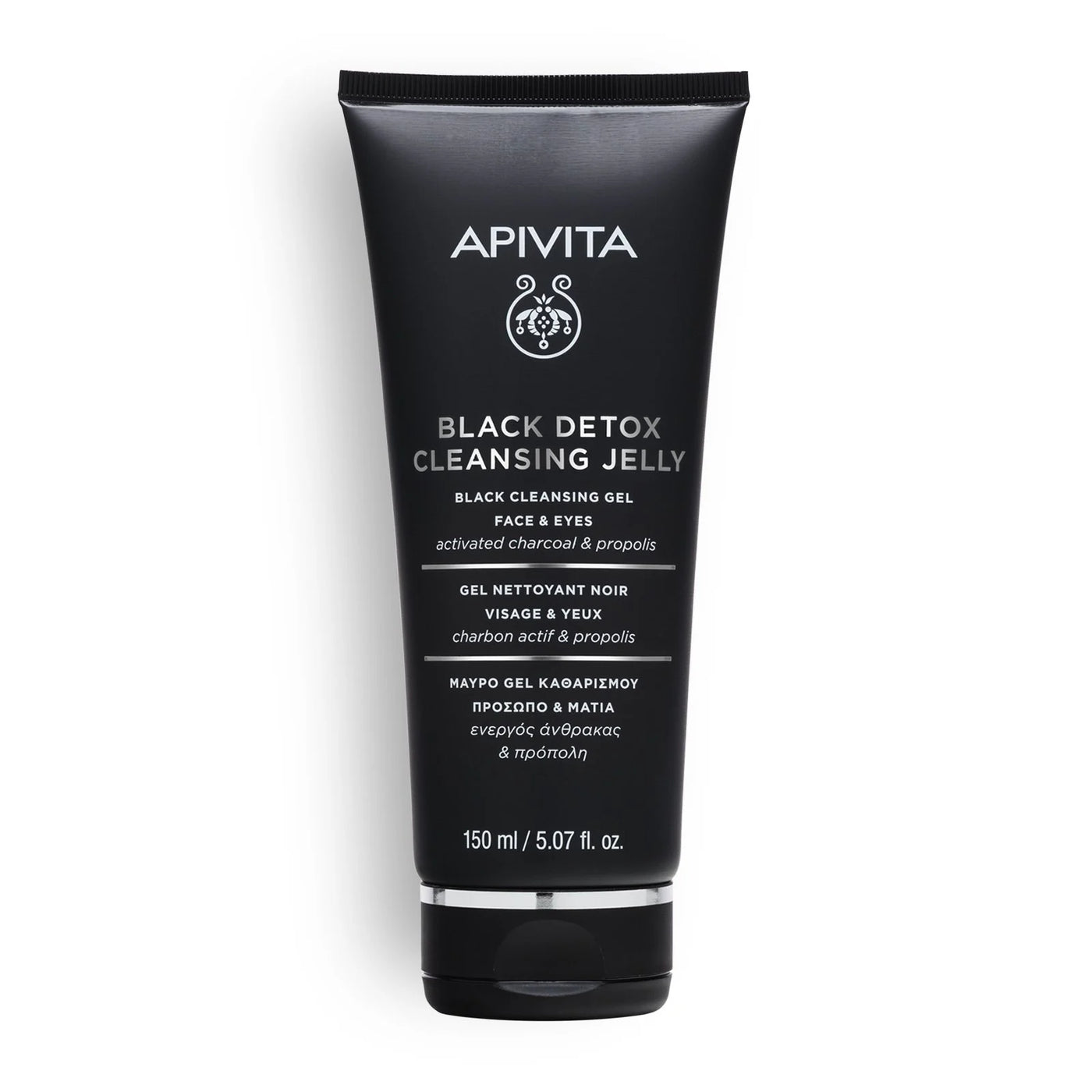 Black detox cleansing gel with activated charcoal and propolis to effectively cleanses the face and eyes without causing dryness.