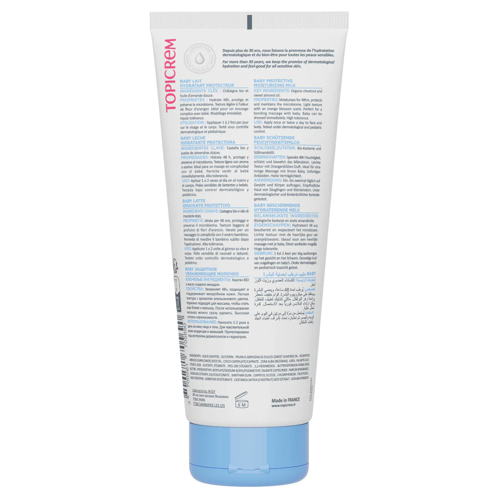 Enriched with organic chestnut, beeswax and urea, our moisturizing body milk strengthens the skin barrier and preserves the microbiome. Its light and fluid texture penetrates quickly, and soothes baby's skin, providing comfort . BABY Protective Moisturizing Milk also allows easy dressing immediately after application.