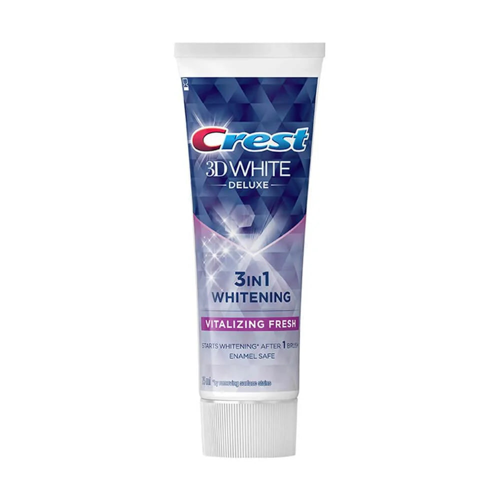 Crest 3D White Deluxe combines whitening, strengthening, and enamel protection in one safe formula that gently removes surface stains and refreshes with mint flavor.