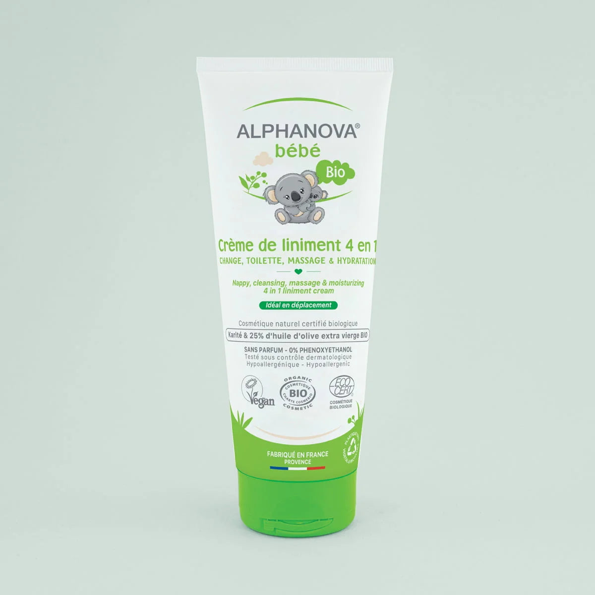 ALPHANOVA Bébé® Organic 4-in-1 liniment cream is a natural, vegan, Organic certified, multi-purpose care product that is innovative, practical and economical. Thanks to its organic liniment-based formula, it can be used as a cleansing milk, moisturiser, diaper cream or even a massage balm. This clever product will replace several products when you go out with baby. Formulated with 25% organic virgin olive oil and enriched with chamomile and organic shea butter. It is particularly gentle and moisturising for baby’s skin.