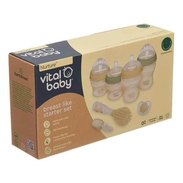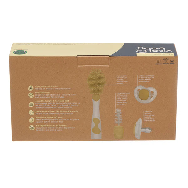 Included in the pack: 2x 150ml biodegradable bottles, 2x 240ml biodegradable bottles, 4 x newborn flow teats, 1 x bottle & teat brush and 1 x biodegradable soother