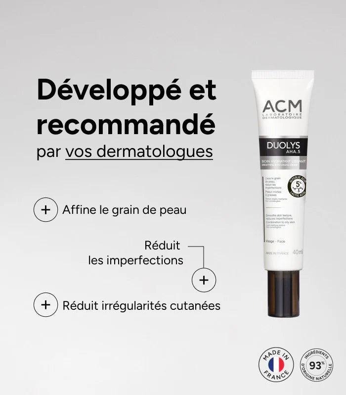 DUOLYS AHA.5 is a Smoothing Moisturizer designed for combination to oily skin. Its expert formula is formulated with fruit acids, AHAs, including glycolic acid for its peeling effect and lactic acid, which promotes cell renewal. This treatment provides the skin with gentle exfoliation. Dead cells are removed for a refined skin texture and visibly reduced pores. Application after application, skin texture improves, the skin is smoothed, brighter, and mattified.