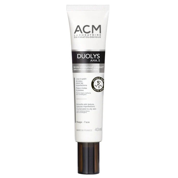 DUOLYS AHA.5 Smoothing Hydrating Cream smooths skin texture and reduces imperfections in combination to oily skin with its innovative 5% AHA formula (glycolic acid and lactic acid).