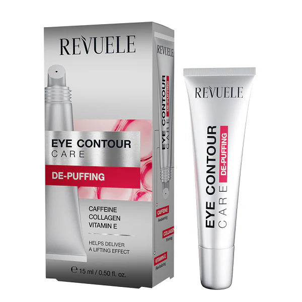 REVUELE EYE CONTOUR CARE DE-PUFFING. The ultimate solution for tired, puffy eyes that will rejuvenate, and refresh the eye contour area. The powerful formula with Caffeine reduces the appearance of puffiness and eye bags, while Collagen works to replenish the skin’s moisture barrier, leaving skin hydrated and supple. Enriched also with Vitamin E to revitalize and nourish the delicate skin around the eyes, restoring a youthful look.