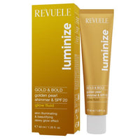 Revuele gold & bold glow fluid is a shimmering face and body fluid that provides a radiant, dewy glow with added sun protection. Infused with mica for a golden shimmer, it also contains spf 20 to protect the skin from harmful uv rays. Ideal for achieving a luminous complexion, this versatile product can be used alone, as a primer, highlighter, or mixed with makeup.