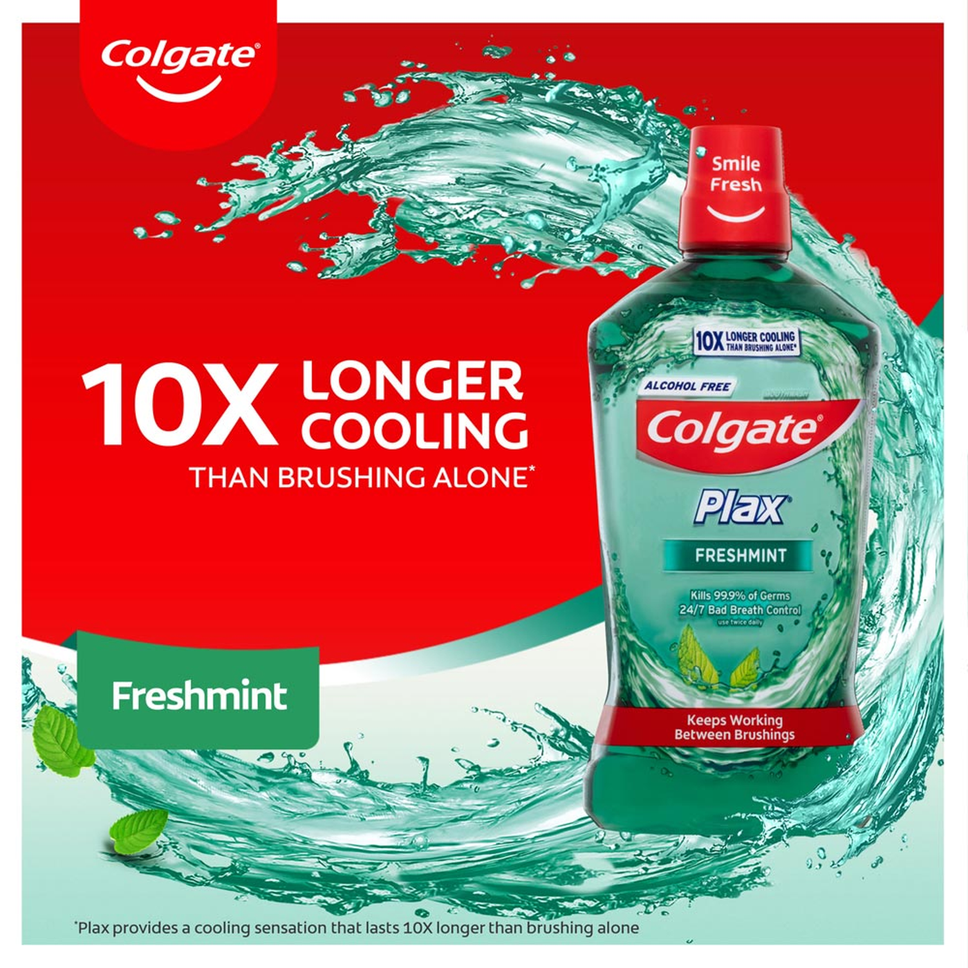 Colgate Plax Antibacterial Alcohol Free Mouthwash kills 99.9% of germs and provides 24/7 bad breath control*. Colgate Plax provides a cooling sensation that lasts 10x longer than brushing alone. Use twice daily for a healthier, fresher mouth.