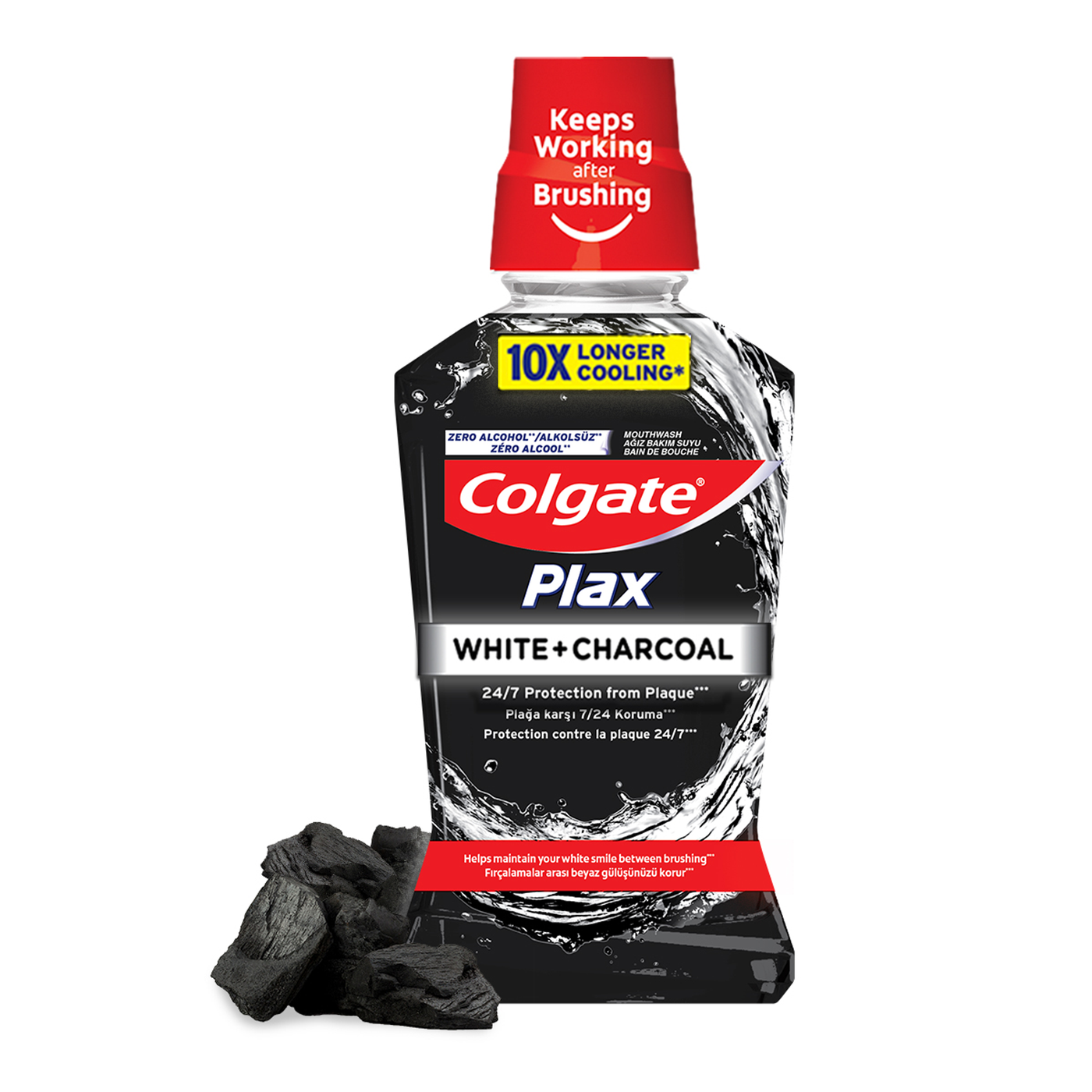 Colgate® Plax Charcoal 500ml Mouthwash provides advanced stain-protection power**** and long-lasting freshness. It is a clinically proven, 100% alcohol-free** anti-germ mouthwash that offers 12-in-1 benefits, as well as 24/7 protection from plaque***. Colgate® Plax Charcoal is formulated with stain prevention actives which inhibit stain formation on teeth therefore keeping teeth whiter for longer, compared to regular mouthwash that does not contain stain prevention actives.
