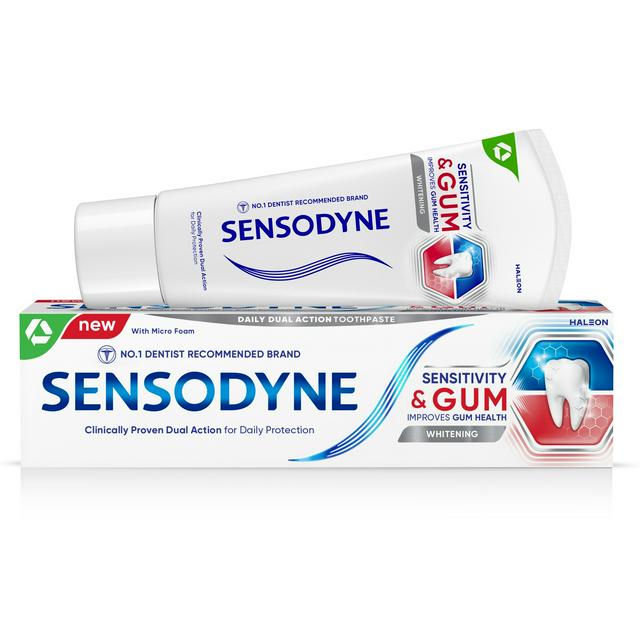 Sensodyne Sensitivity & Gum Whitening is a dual action toothpaste specifically designed to help people with both sensitivity and gum problems. With its low abrasion formula, Sensodyne Sensitivity & Gum Whitening is uniquely formulated to relieve tooth sensitivity and improve gum health at the same time. It builds a protective layer over sensitive areas, while targeting and removing plaque bacteria to help reduce swollen, bleeding gums. Plus, it gently lifts stains for whiter teeth. You can take control of both these concerning problems with one specialized toothpaste.