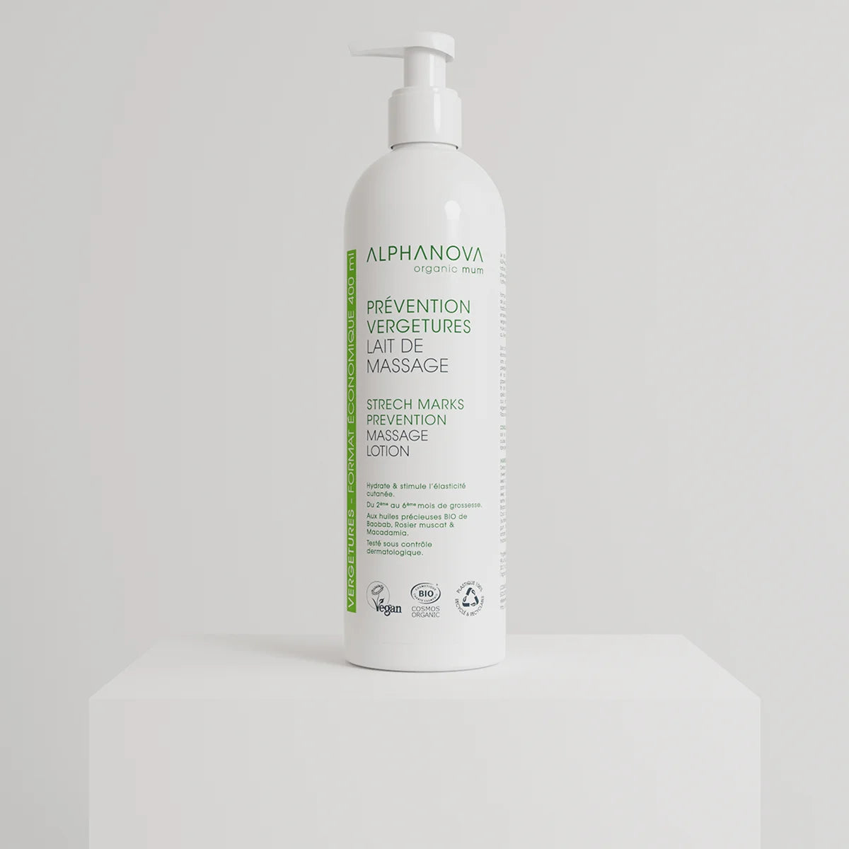 Massage milk – Stretch Mark Prevention – ALPHANOVA organic mum is an innovative, natural, certified organic, paraben-free, phenoxyethanol-free cosmetic treatment for the prevention and reduction of emerging stretch marks. Moisturizing and softening formula based on organic aloe vera juice and organic oils traditionally used by pregnant women around the world to prevent stretch marks: (Baobab Oil from South Africa, Rosehip Oil and Macadamia Oil from Kenya). Natural origin treatment (99.4%), economical 400 ml pump bottle. Free from essential oils, parabens, phenoxyethanol, allergens**.