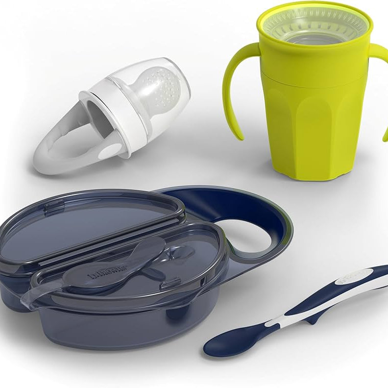 TODDLER FEEDING ESSENTIALS. Comes with 1 β Travel Fresh Bowl and Spoon 4m+, 1 β Cheers360 Spoutless Training Cup with Handles 6m+, 1 β Fresh Firsts Silicone Feeder 4m+