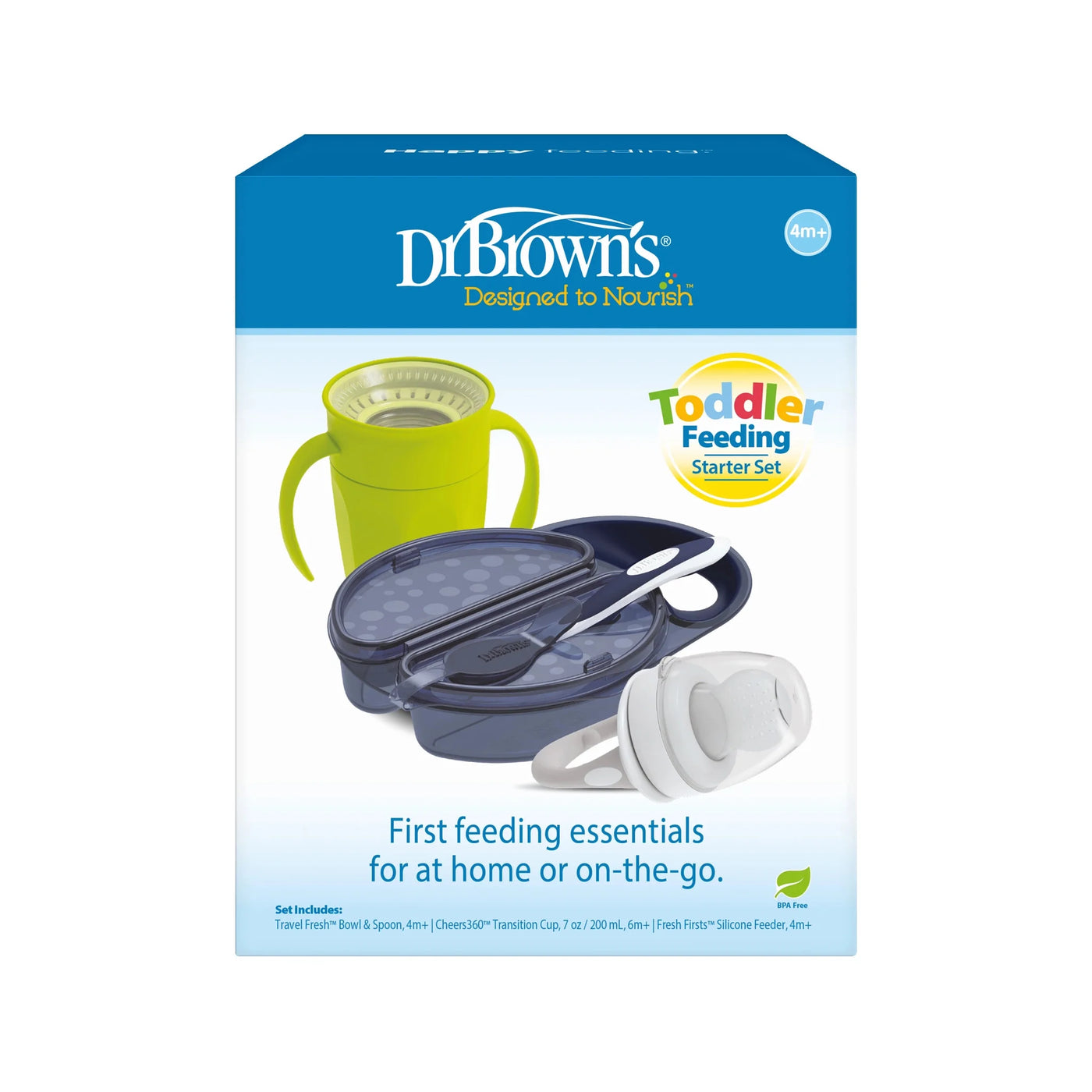 Feeding your little one on-the-go just got easier with Dr. Brown's Toddler Feeding Starter Set. The Travel Fresh Bowl and Spoon lets you securely travel with meals for your little one. It features two separate compartments to bring different foods, and the included spoon snaps onto the bowl keeping it clean and in place. The Cheers360 sippy cup lets baby drink from any edge, and the Sip and See clear silicone valve lets baby see inside without spilling for true leak-free learning. Handles designed with your little one in mind are easy to grasp and tilt while developing independent drinking skills. The Fresh Firsts Silicone Feeder lets you safely introduce solid foods to little one and can hold anything from fresh food to frozen treats like fruit, vegetables, purees, milk, and more. All items are dishwasher (top rack) and sterilizer safe. BPA free. 6m+. Contents Include: 1 β Travel Fresh Bowl and Spoon, 1 β Cheers360 Spoutless Training Cup with Handles, 1 β Fresh Firsts Silicone Feeder