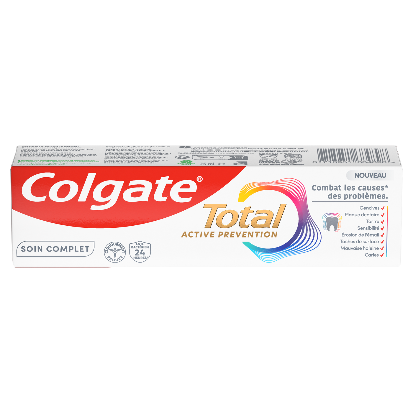 Protect the health of your smile before oral problems develop with our Colgate Total Active Prevention Complete Care toothpaste. Our toothpaste fights the root cause* of many oral problems³, scientifically developed with a unique process to ensure active prevention and superior performance⁴. It's clinically proven to provide 24-hour antibacterial protection¹. Thanks to its high-quality, patented² preventative technology, our toothpaste helps prevent the 8 most important oral problems. It's the protection your smile needs to prevent future oral problems.
