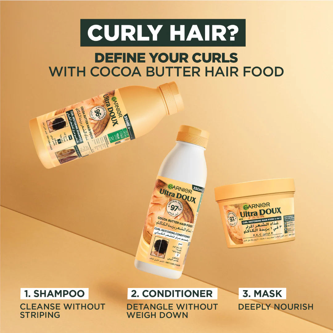 Garnier Ultra Doux Vegan Hair Food, our new way to nourish hungry hair. With 97% Natural Origin and 100% Vegan Blends, it is enriched with Super Food Extracts for Super Hair. This ultimate blend of Cocoa Butter & Jojoba Oil is a nourishing 3-in-1 hair mask treatment for Curly Hair. 3 ways to enjoy Cocoa Butter Hair Food: as a Hot Oil Bath, as a Mask, or as a Leave-in Cream.
