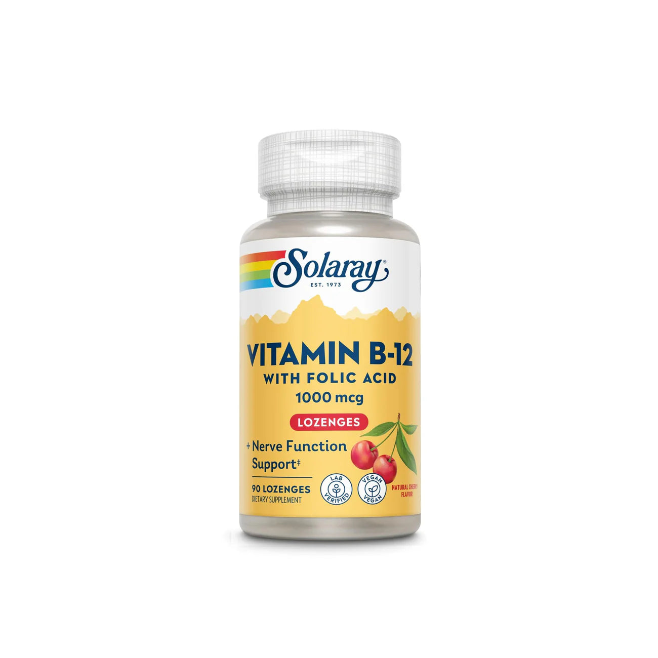 Vitamin B-12 may help support healthy metabolism, normal red blood cell production, and nerve function. Vitamin B-12 is a water-soluble vitamin that must be obtained through your diet. Solaray Vitamin B-12 is a high-potency supplement designed to help support healthy hair and skin, brighten your mood, and light up your energy.