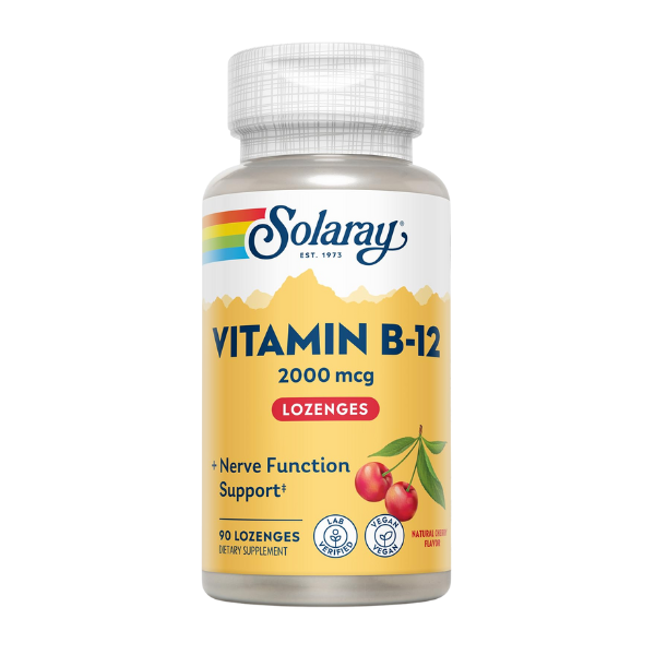 Vitamin B-12 may help support healthy metabolism, normal red blood cell production, and nerve function. Vitamin B-12 is a water-soluble vitamin that must be obtained through your diet. Providing 2,000 mcg or 83,333% DV of this essential nutrient, Solaray Vitamin B-12 is a high-potency supplement designed to help support healthy hair and skin, brighten your mood, and light up your energy.
