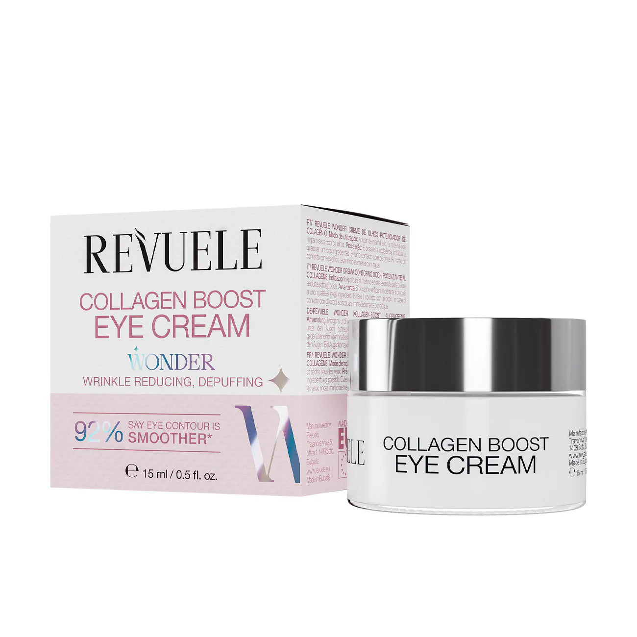 Revuele wonder collagen boost eye cream is a revitalizing treatment for the delicate eye area. It’s formulated to reduce the appearance of fine lines, puffiness, and dark circles, while deeply hydrating and smoothing the skin. With active ingredients like collagen, peptides, niacinamide, macadamia oil, and extracts from marine algae, it helps leave the eye area looking firmer, brighter, and more refreshed.